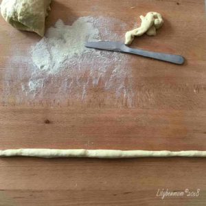 - Prendi un pezzetto di impasto e stendilo con le mani rotolandolo sulla spianatoia fino a creare una sorta di serpentello.