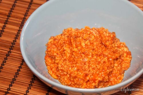 Trita l’aglio e la menta a mezzaluna o se preferisci con un mixer a lame.